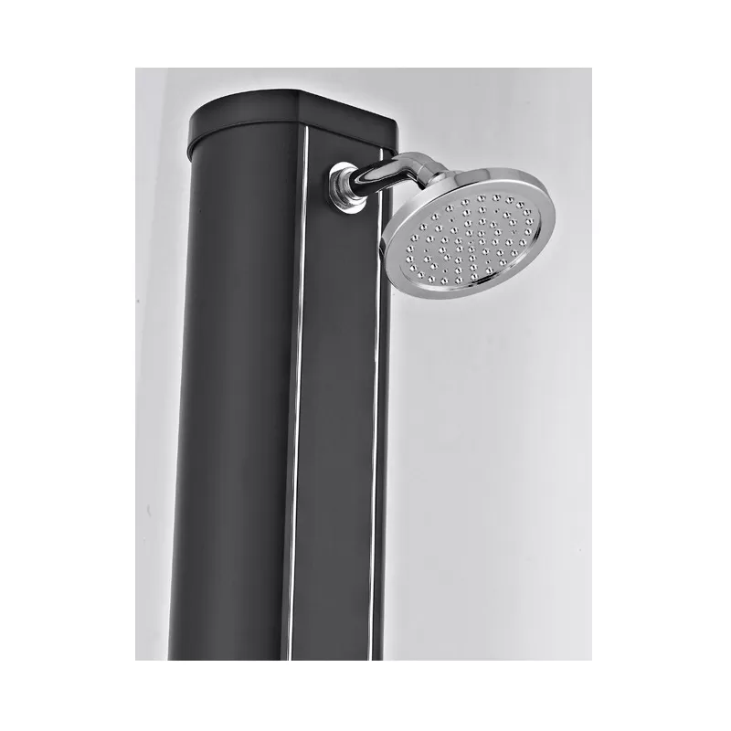 Ducha solar fabricada en aluminio oscuro, lo que la dota de un aspecto elegante.Con una sola toma de agua fría, permite el calentamiento de ésta mediante un deposito acumulador de aluminio de 32 litros, aprovechando la energía solar.