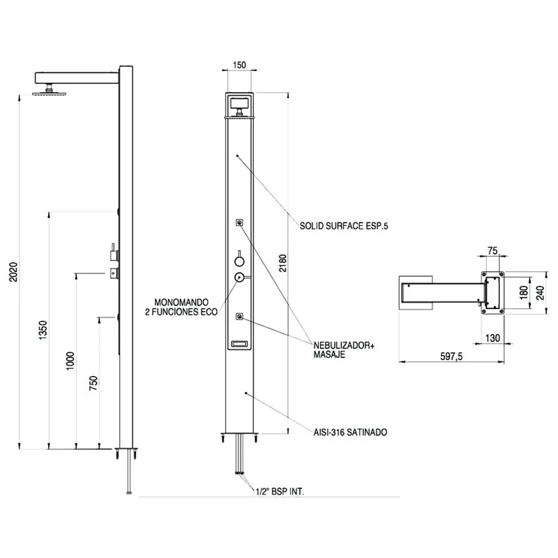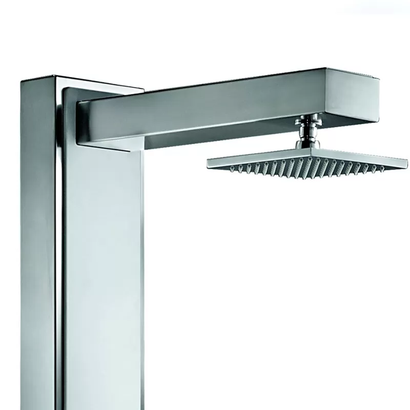 Ducha de acero inoxidable mate AISI-316 que incorpora embellecedor frontal blanco en "solid surface". Rociador cenital cuadrado de latón cromado antical, 2 jets frontales con efecto nebulizador controlado por una válvula inversor de 2 vías. Caudal y temperatura del agua están reguladas por una válvula mezcladora.