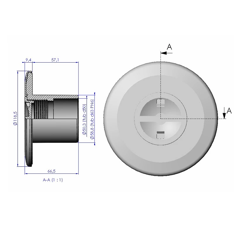 Pool-Saugstutzen zum Aufkleben auf d.63-Rohr (innerhalb des 63-Rohrs PN.6) oder d.50-Rohr (außerhalb des 50-Rohrs). Hergestellt aus weißem ABS mit 1 1/2'' Gewindestopfen. Endanschluss 07958 und Fitting 01393.