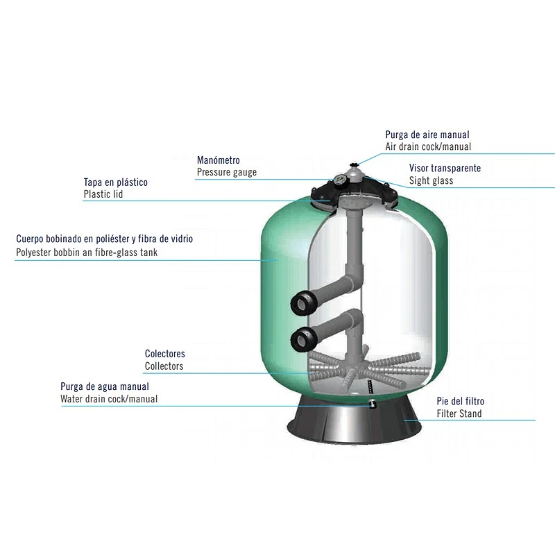 Seine gewickelte Oberfläche macht ihn sehr widerstandsfähig und seine blaue, satinierte Oberfläche verleiht ihm im Vergleich zu anderen Filtern ein viel attraktiveres Aussehen. Die Berlin-Filter sind in Durchmessern von 500 mm bis 1200 mm erhältlich, so dass sie in privaten Schwimmbädern mit großem Volumen installiert werden können. Die Sandfilter sind aus Polyesterharz und Glasfaser gewickelt.