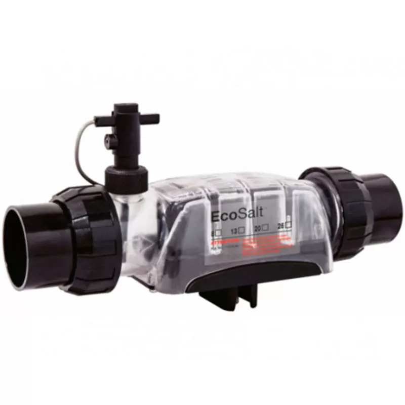 EcoSalt ist mit einem Durchflussschalter ausgestattet, der Sicherheit und Schutz bei geringem oder fehlendem Durchfluss bietet. Außerdem verfügt es über eine kompakte, leistungsstarke, transparente Inline-Zelle.