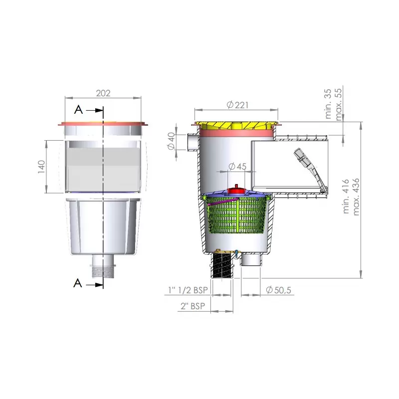 - Oberer Anschluss für den Abfluss des überschüssigen Wassers: Ø 40.