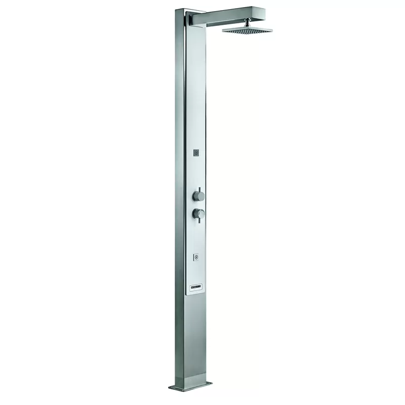 Dusche aus mattem Edelstahl AISI-316 mit weißer Frontverkleidung aus "Solid Surface". Quadratischer Brausekopf aus verchromtem Messing, 2 Frontdüsen mit Vernebelungseffekt, gesteuert durch ein 2-Wege-Umschaltventil. Wasserdurchfluss und Temperatur werden über ein Mischventil geregelt.