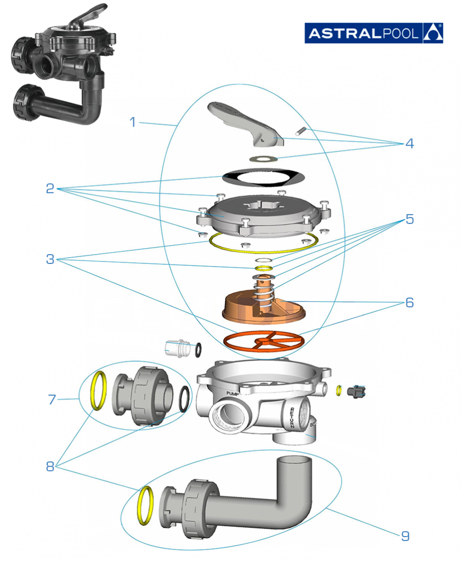 Spare parts selector valve Astralpool side 1" 1/2 Flat 34543
