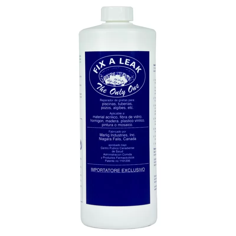 Fix a Leak is a concentrated blended material designed to seal leaks in virtually any material. Leak repair for all types of pools and tanks including piping systems. Operates within 24 hours. Applicable on acrylic, fibreglass, concrete, wood, vinyl plastic, paint or mosaic.