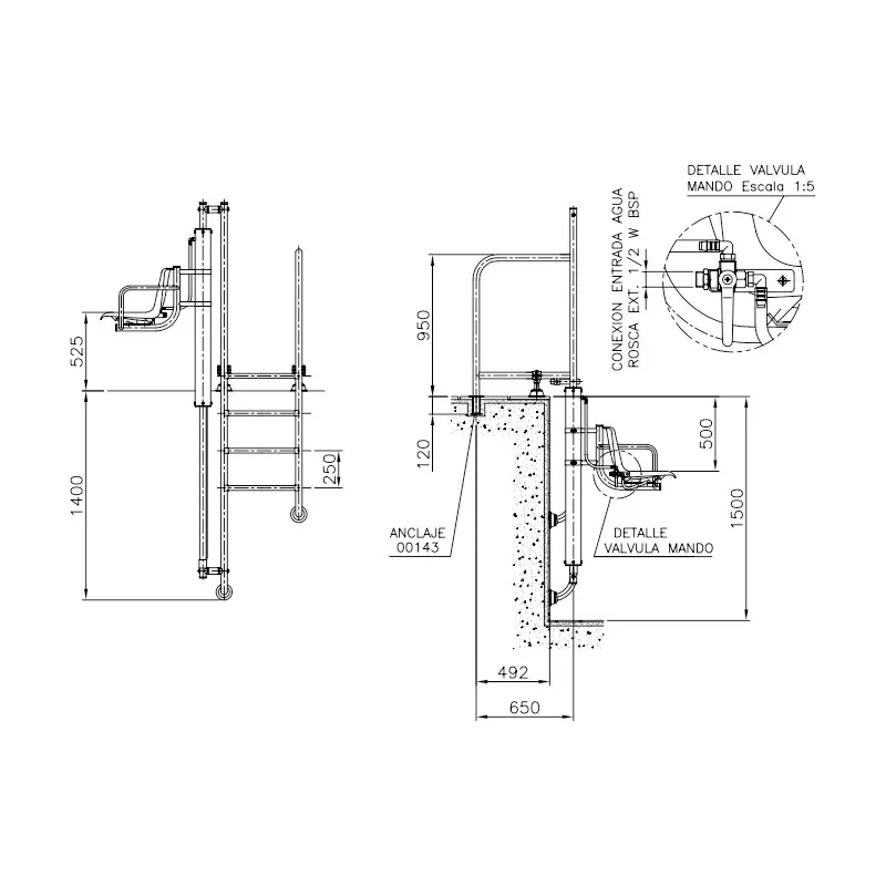 For the mechanism to work, it is necessary to have a water supply with a minimum pressure of 3.5 Kg/cm2. To complete the set, the handrail is necessary, together with the hydraulic cylinder and the complements.