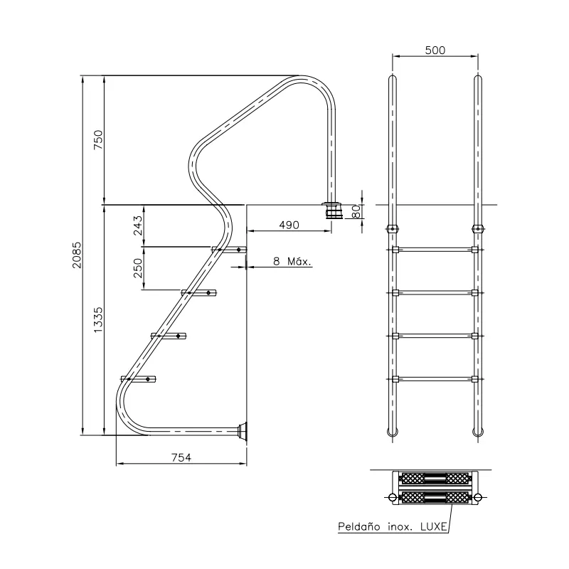 - With handrail Ø 43mm and Luxe steps in stainless steel. AISI-316 with double anti-slip surface