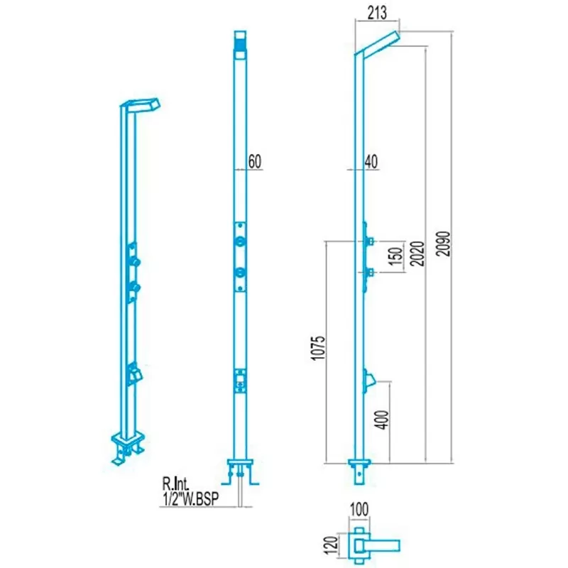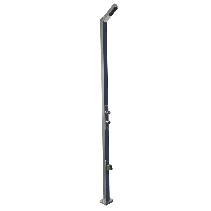 Shower for public use with 1 shower head and 1 footbath tap controlled by 2 timed pushbuttons. The use of timed technology avoids unnecessary water consumption.
