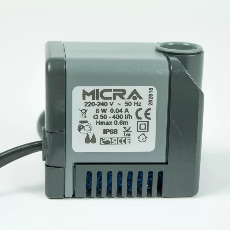 Micra is a fully submersible pump driven by a permanent magnet synchronous motor. Micra has an interchangeable sponge filter and offers variable flow regulation from 400 to 600 l/h, via a 5-position tap.