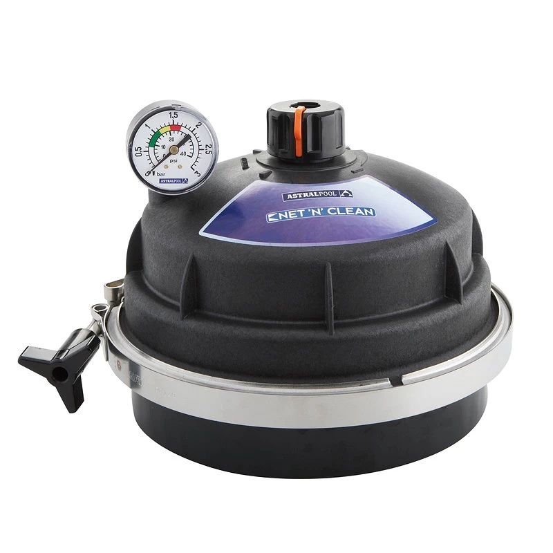 Le Net'N'Clean est un système de nettoyage efficace, composé d'une vanne de distribution à six voies, qui reçoit l'eau d'un système d'aspiration indépendant du système de filtration et la distribue de manière séquentielle à une série de buses situées au fond de la piscine. Ce type de distribution à partir du fond maintient les particules en suspension afin qu'elles soient collectées par le skimmer et le puisard et retenues par le filtre.