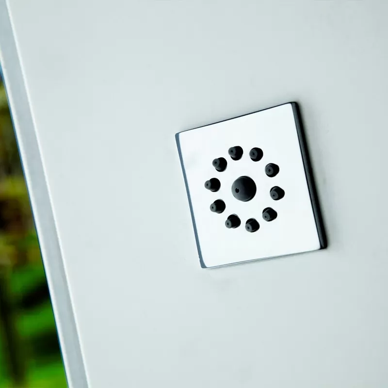 Douche en acier inoxydable AISI-316 mat avec garniture frontale blanche en "solid surface". Pomme de douche zénithale carrée en laiton chromé, 2 jets frontaux avec effet nébulisant commandés par une vanne d'inversion à 2 voies. Le débit et la température de l'eau sont réglés par un mitigeur.