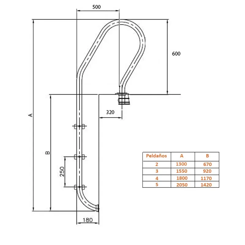 - Tubo di 43 mm di Ø e 4 gradini antiscivolo in acciaio inox.