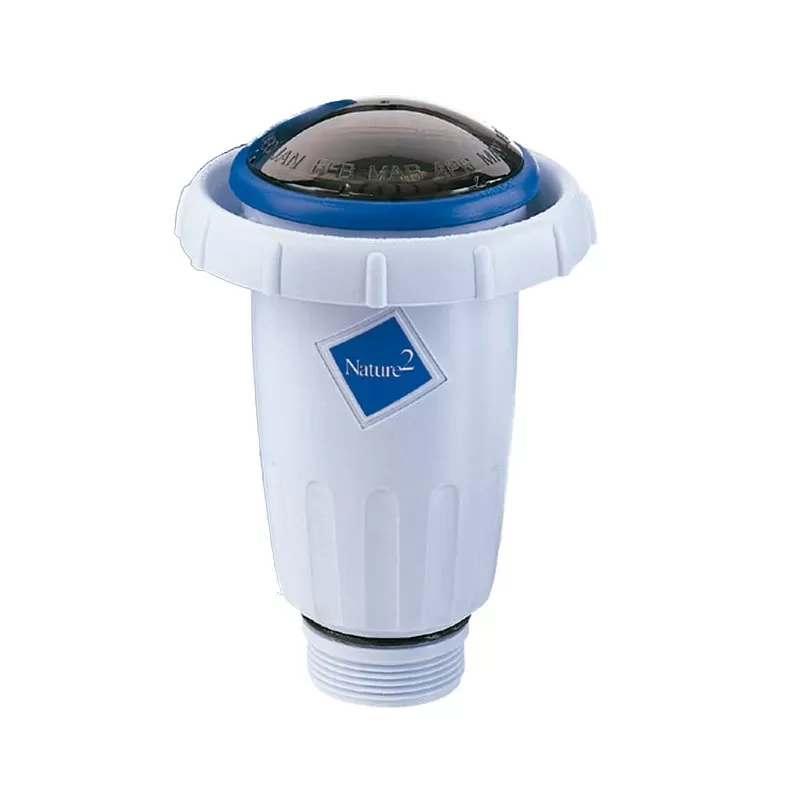 - L'ossidante (prodotto dal cloro, dall'elettrolisi del sale, dall'ozono, dai raggi UV) deve essere utilizzato come complemento e in dosi ridotte per ossidare le alghe e i batteri indeboliti da Nature 2, che si accumulano sulla superficie minerale della cartuccia.