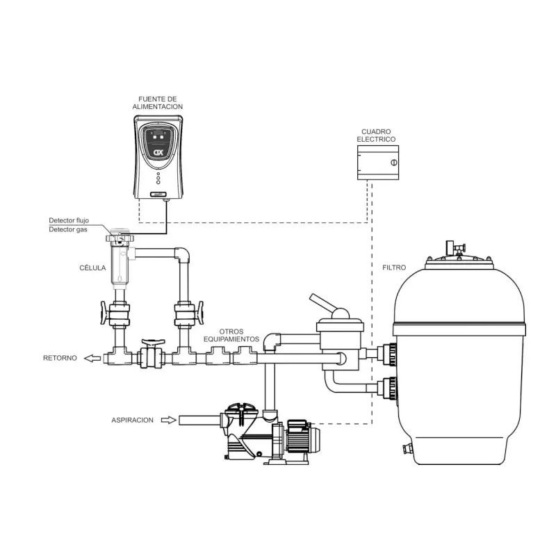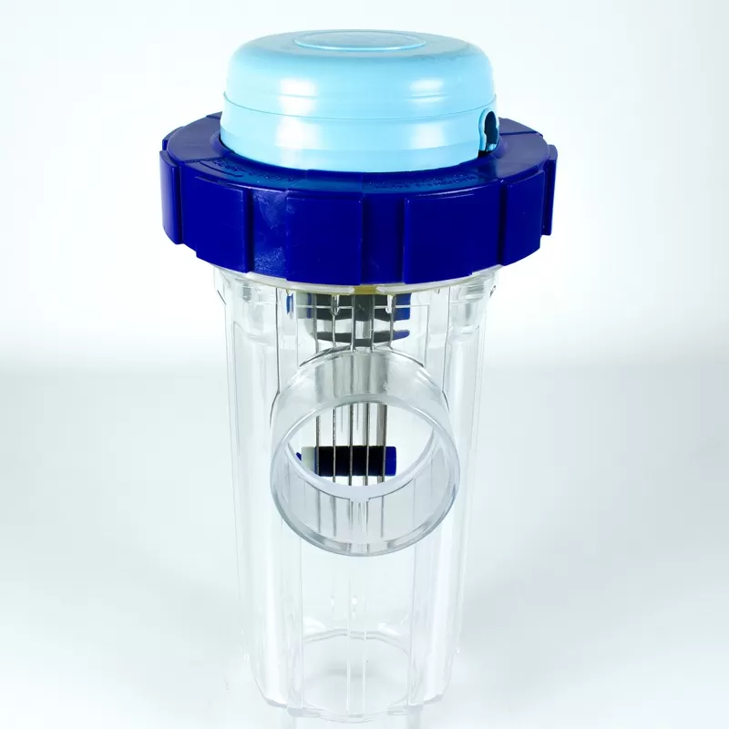 Disinfezione mediante elettrolisi salina con elettrodi in titanio autopulenti con inversione elettronica della polarità, microprocessore e rilevatore di flusso inclusi.