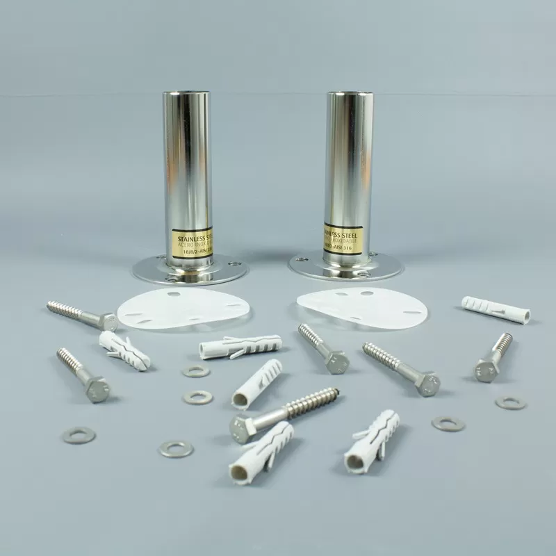 Ancoraggio smontabile con piastra per tubo Ø 43 mm, con giunti elastici, tasselli e viti.