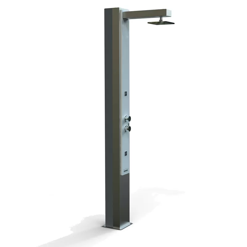 Doccia solare in acciaio inox opaco AISI-316 con rivestimento frontale in acrilico bianco. Soffione quadrato zenitale in ottone cromato anticalcare, 2 getti frontali con effetto nebulizzatore comandati da una valvola di inversione a 2 vie. Dotato di ingresso per l'acqua fredda, permette di riscaldare l'acqua grazie a un serbatoio di accumulo in alluminio da 25 litri che sfrutta l'energia solare.