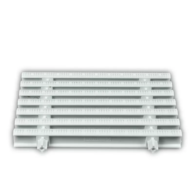 Dwars overlooprooster gemaakt van UV-gestabiliseerd PP (polypropyleen). Witte kleur voor het hele gamma. Het wordt aanbevolen om de overloopgoot 5 mm breder te maken dan het rooster, zodat het rooster gemakkelijk kan worden aangepast en mogelijke uitzetting wordt voorkomen.