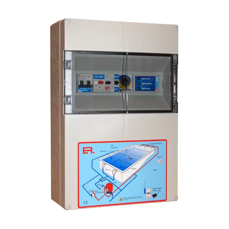 Elektrische panelen met IP65/66 waterdichte kasten voor de automatische regeling van overloopbaden. Elektronische beveiliging en besturing van filterpompen en vulmagneetkleppen.