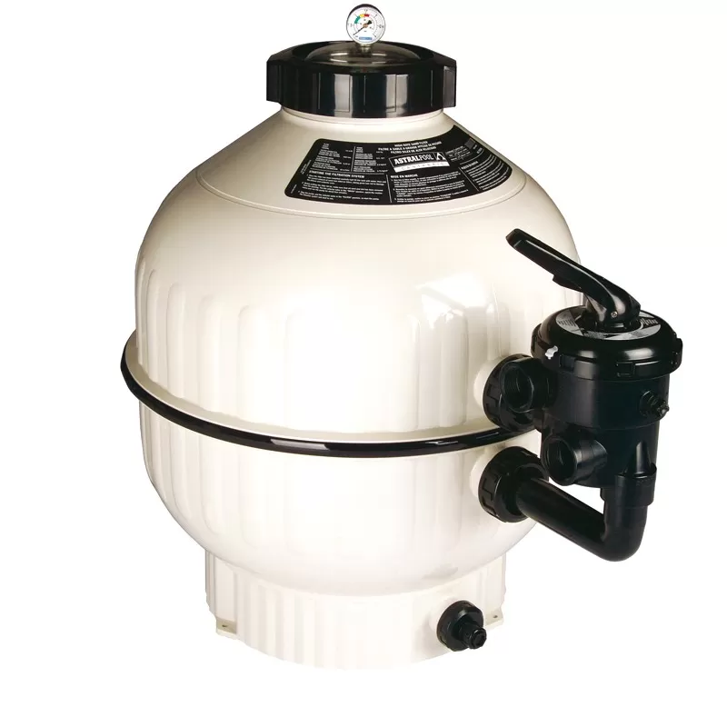 - standaard uitgerust met de 6+1 selectieklep van AstralPool, 1 1/2" voor diameters van 400 mm, 500 mm en 600 mm, 2" voor diameters van 750 mm en 2 1/2" voor diameters van 900 mm, met bajonetsluiting, voor filteren, wassen, spoelen, recirculatie, legen, sluiten en overwinteren (alle inlaten en uitlaten zijn aangesloten).