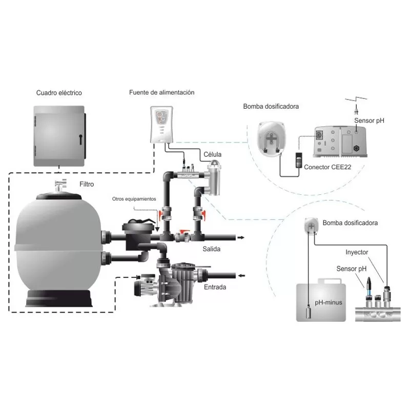 Zoutchlorator Idegis Tecno DT-30 voor zwembaden tot 80-120m3. Ideaal voor kleine technische ruimtes. Cel met parallelle inlaat en uitlaat.