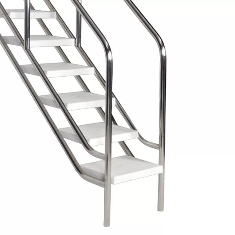 Regulável em altura. Fácil de instalar. Fabricado em tubo de aço inoxidável AISI-316 polido de Ø 43 mm. Degraus de plástico com superfície antiderrapante.